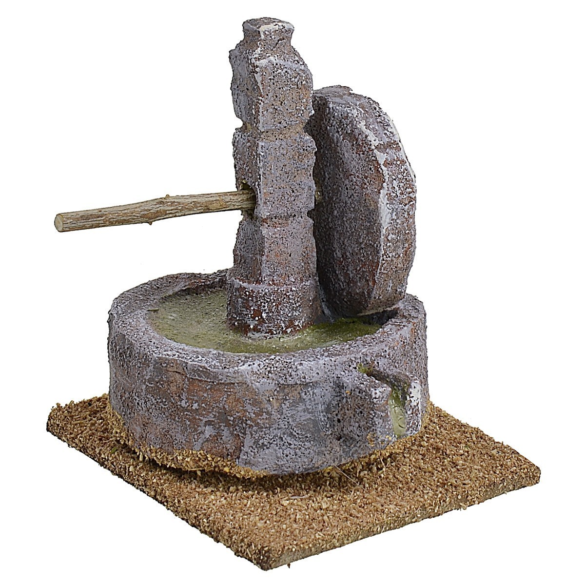 Molino artesanal para la extracción de aceitunas realizado en poliestireno, madera de corcho y musgo, recomendado para estatuas de 6 cm de altura.