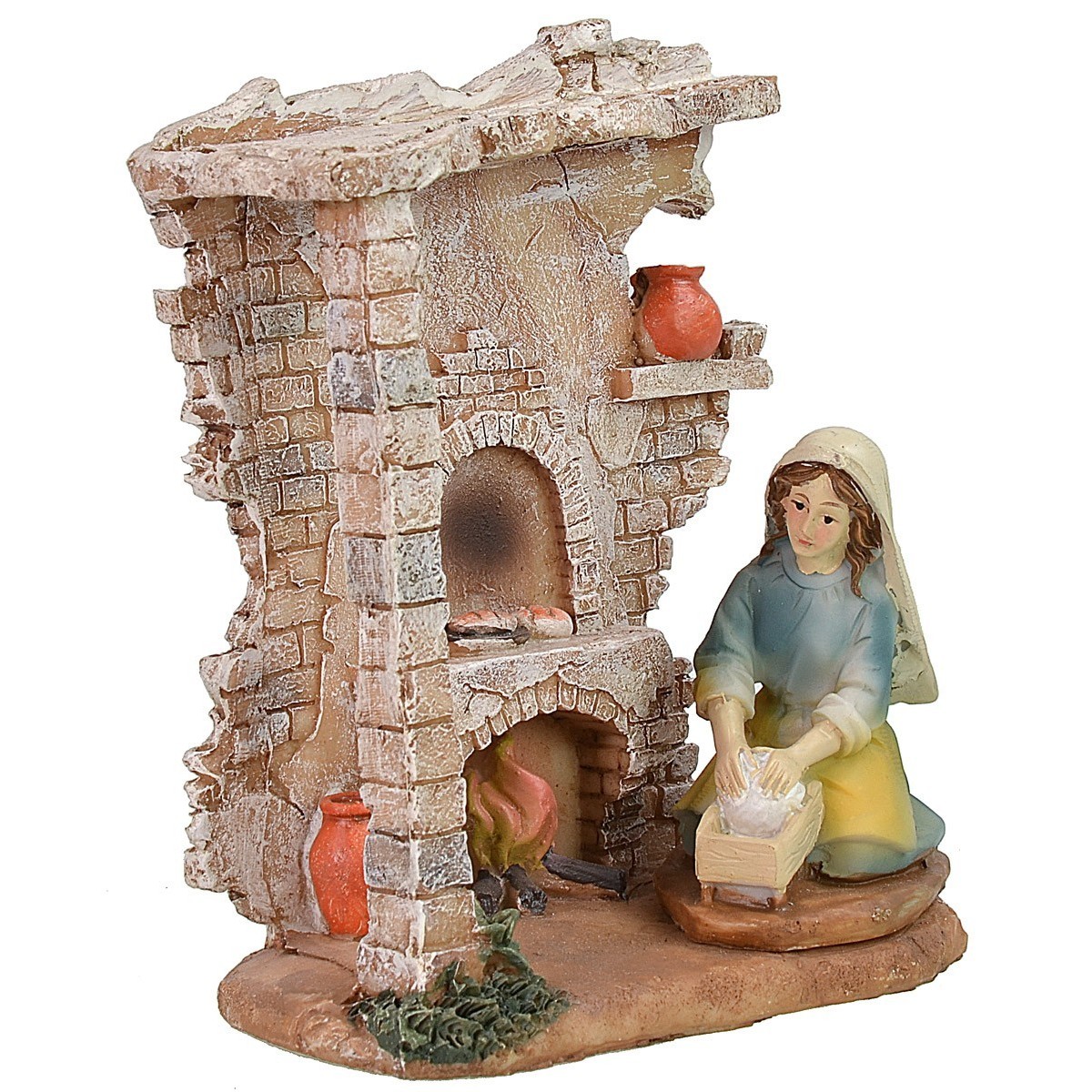 Taller en resina que reproduce el horno de dos pisos con la leña ardiendo abajo y el pan cocinándose arriba. A la derecha, una jarra enriquece la escena, mientras que en primer plano está la estatua de la mujer arrodillada que está amasando la harina en el recipiente.