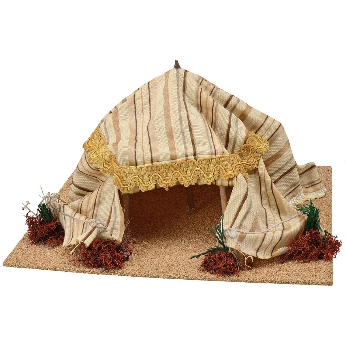 Tienda palestina de forma circular finamente revestida con tela adornada con encajes dorados, la tela se sostiene sobre una estructura de troncos de madera y la escena se completa con líquenes coloridos y vegetación.El artículo es recomendado para estatuas de altura de 8-10 cm de Landi y ha sido producido por artesanos italianos en madera y tela.