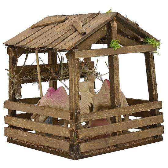 17Recinto para animales con dos camellos de 8 cm de altura en su interior. El escenario está bien acabado con un cobertizo, un pesebre, mechones de liquen y completo con accesorios pequeños (una pala, una ánfora con agua y un cuenco con liquen). Producto realizado íntegramente en Italia por hábiles manos artesanas, utilizando madera y corcho, recomendado para estatuas Landi de 8-10 cm.
