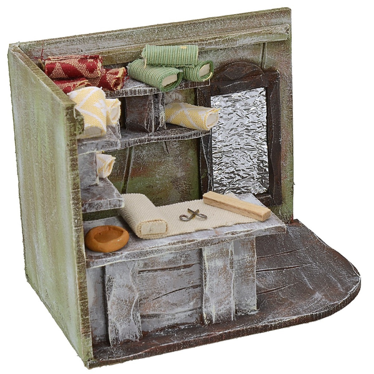 Taller del sastre con banco para el corte de tela, en la pared están colgadas varias estanterías con retales de varios colores y diseños y un espejo que completa la escena. El producto está realizado en madera y poliestireno y es recomendado para estatuas de altura de 10 cm. En los productos relacionados debajo de la tabla es posible encontrar la estantería para combinar.