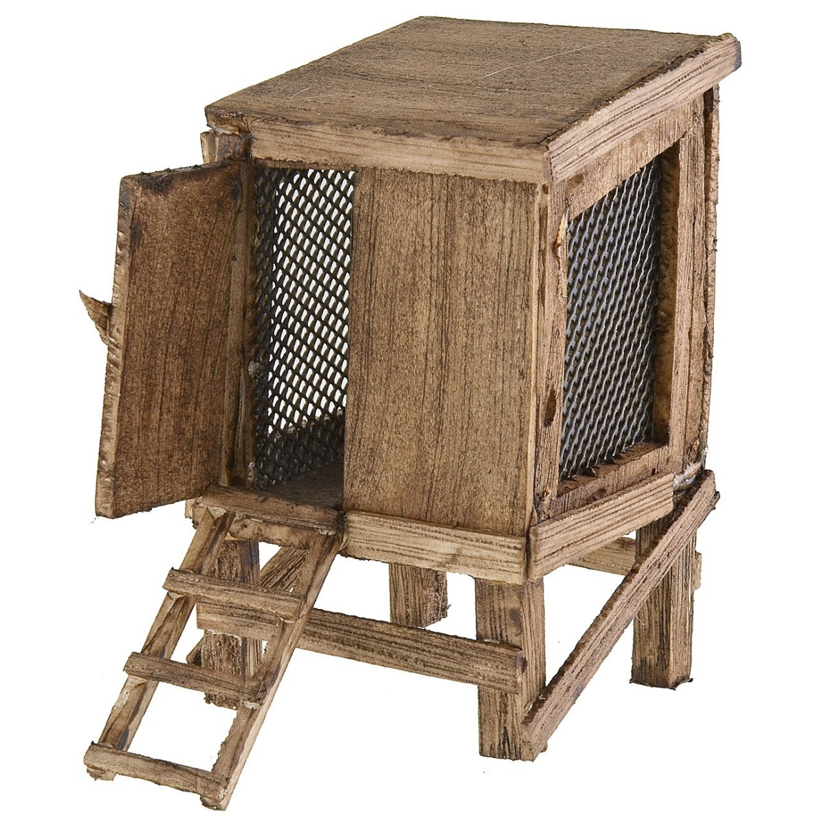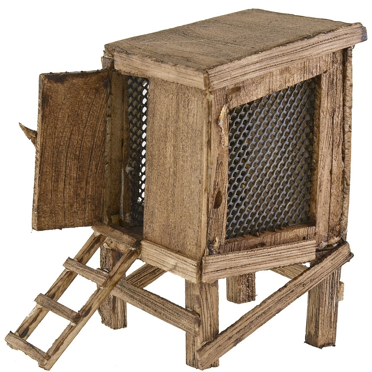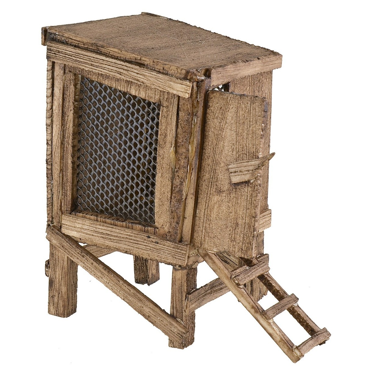 Escenografía para pesebre de un gallinero elevado al que se accede mediante una escalera. El artículo es adecuado para estatuas de pesebre de altura 10-12 cm y ha sido producido artesanalmente en Italia con poliestireno efecto madera.