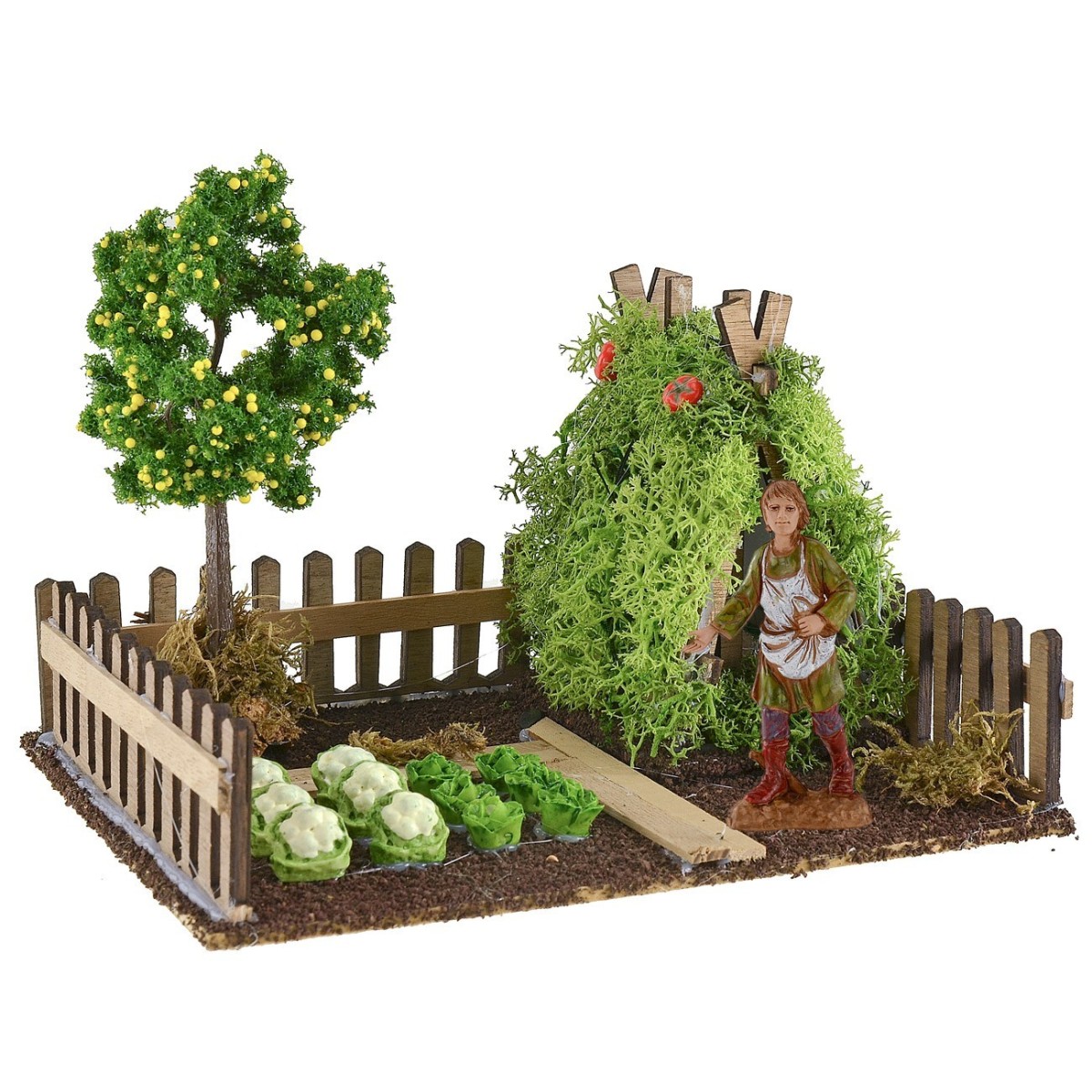 Huerto para belén cercado por una valla de madera, a la izquierda hay parterres de verduras delimitados por un sendero de madera, mientras que detrás se alza una planta llena de limones. A la derecha, altas plantas de tomates sujetas a algunas tablas. Este escenario para belenes ha sido realizado por hábiles artesanos italianos en madera y corcho, la estructura es adecuada para estatuas de altura de 8-10 cm. La imagen con la figurita es solo demostrativa, el artículo está disponible para la compra en los productos relacionados debajo de la tabla.