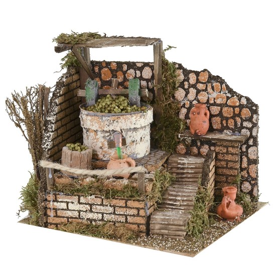 Molino para belén que funciona con corriente y completo con bomba para reciclaje continuo. Al subir tres escalones se llega al gran molino lleno de aceitunas, de donde, a través de un pico de cobre, brota el aceite que se recoge en una ánfora. La escena está bien acabada entre dos paredes de corcho con efecto de piedras y ladrillos; también hay ánforas, tinas y vegetación como decoración. Este artículo es recomendado para figuras de altura de 8 a 10 cm y para reproducir el color del aceite es posible utilizar colorantes alimenticios disponibles en casi todos los supermercados.