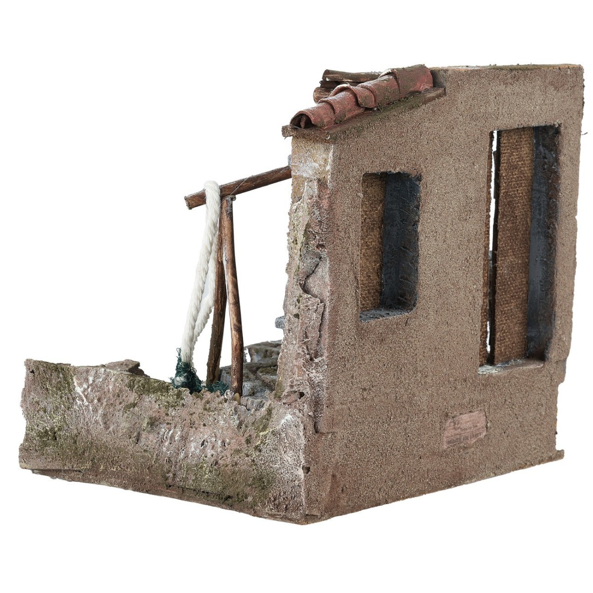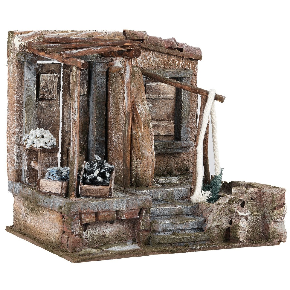 Tienda del pescadero; el puesto se encuentra en un nivel elevado, donde a la izquierda hay un pórtico con cestas que contienen los peces pescados, mientras que en el lado derecho están las redes almacenadas en el compartimento. Se recomienda su uso con estatuas de 10 cm de altura. Se precisa que el pescador no está incluido, pero está disponible en los productos relacionados debajo de la tabla. El artículo está realizado por artesanos italianos en poliestireno y madera.