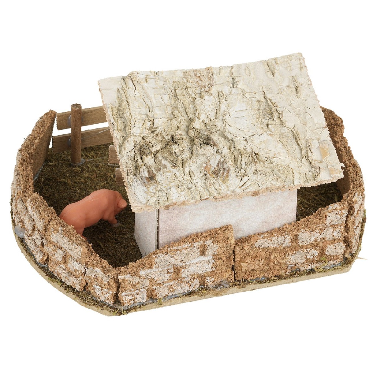 Recinto para la cría de cerdos en el que también se encuentra una pequeña pocilga donde refugiarse. Esta ambientación para belén ha sido realizada artesanalmente en Italia con madera y corcho. El artículo es recomendado para figuritas de altura 7-8 cm.