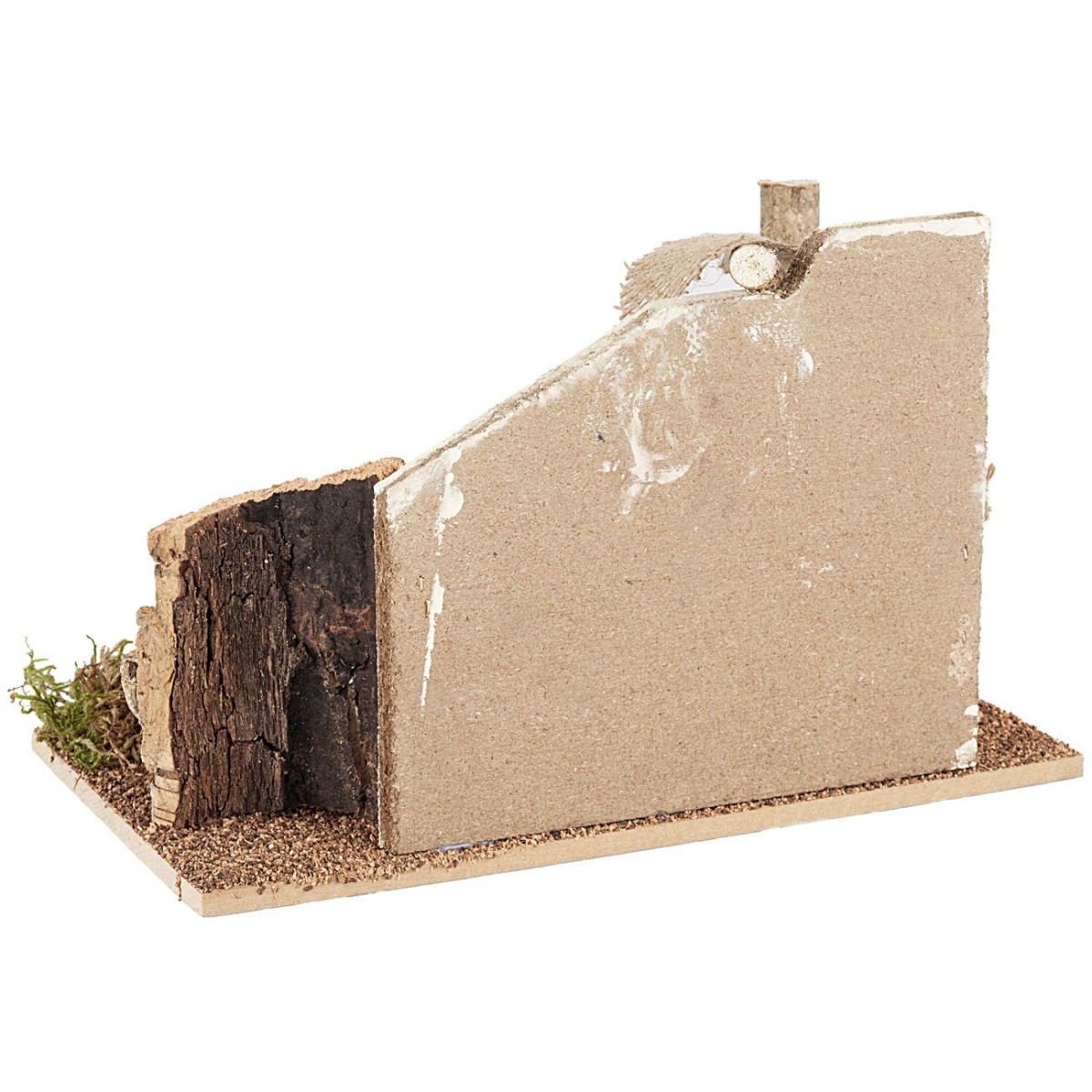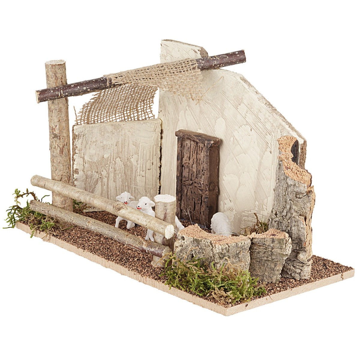 Corral rodeado por una pared con una puerta de madera, un recinto formado por troncos rústicos y un refugio rudimentario para los animales criados compuesto por una lona sostenida también por troncos de madera. En su interior se pueden observar las ovejas. El artículo es recomendado para figuras de altura de 8 a 10 cm y se produce artesanalmente en Italia utilizando madera y corcho.