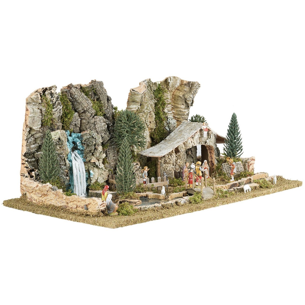 Pesebre de montaña caracterizado por la presencia de una sugerente cascada que se lanza a un pequeño lago efecto profundidad, para confluir en un río. El curso de agua es atravesado por un puente de madera que lleva a la cabaña donde se encuentra la Natividad. El artículo está bien acabado con vegetación y musgo y ha sido realizado en Italia con madera y corcho. Este paisaje se completa con la presencia de las estatuas Landi Moranduzzo cm 6 y 6,5, se precisa que estas estatuas tienen una altura ligeramente inferior respecto al nombre de la serie; además, el artículo será entregado con la misma cantidad de personajes presentes en las imágenes pero las figuras podrían variar según las disponibilidades del momento.