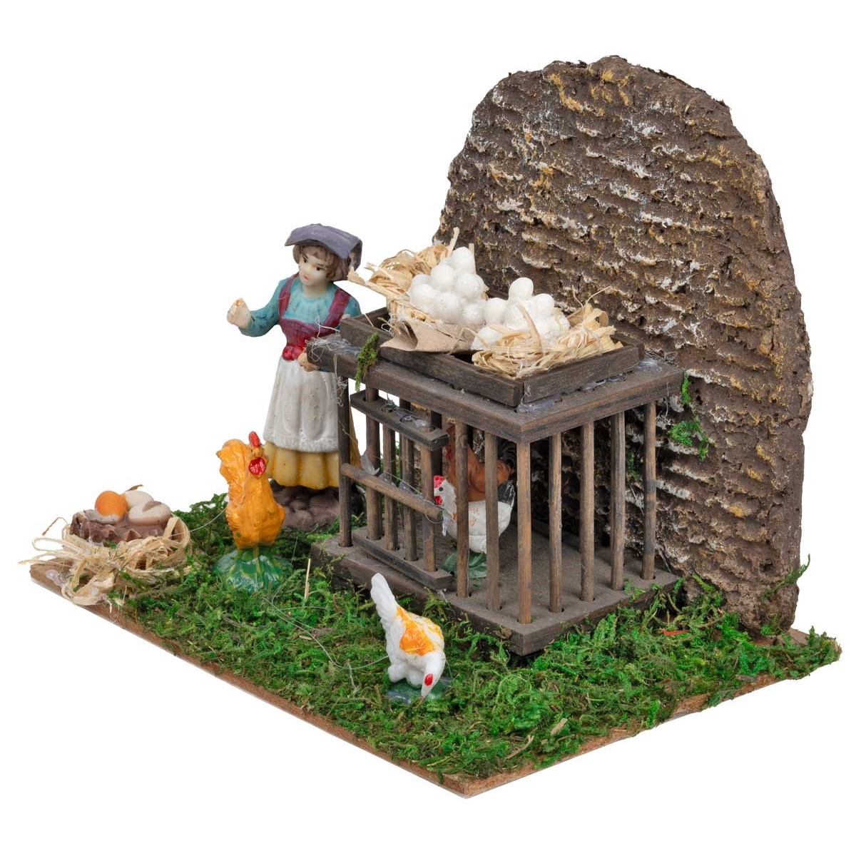 Gallinero con campesina, huevos y gallinas. Esta escena presenta un detallado gallinero de madera, con una jaula para gallinas y nidos con huevos encima. Varias gallinas deambulan por el exterior, junto a un nido con otros huevos, mientras una campesina de resina interactúa con ellas. El fondo es un muro similar a ladrillos. Ideal para combinar con estatuas de altura 8-10 cm. Realizado en madera, musgo y corcho por artesanos italianos, este producto hecho a mano podría presentar ligeras variaciones respecto a la foto. Perfecto para enriquecer tu belén con un toque rústico y auténtico.