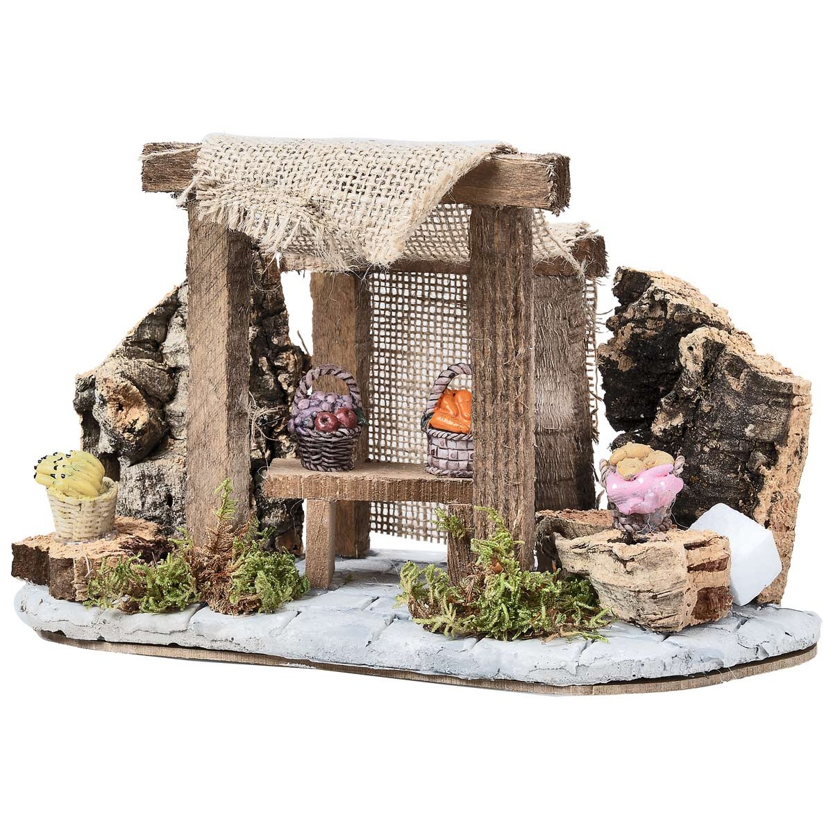 La estructura presenta un pequeño mostrador central con cestas llenas de frutas y hortalizas en miniatura, acompañado de paredes de corteza y terminado con cubierta de tela.