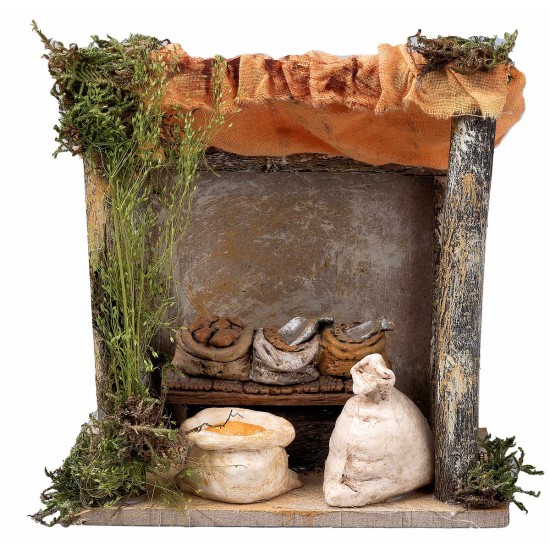 Taller de mercado con sacos de harina y legumbres en miniatura recomendado para figuras de 9-10 cm de altura.