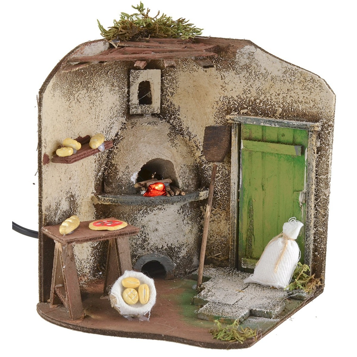 La escenografía representa un típico taller con horno de leña, completo con mesa de trabajo, panes y sacos de harina, pensado para recrear una escena de vida cotidiana dentro del belén.