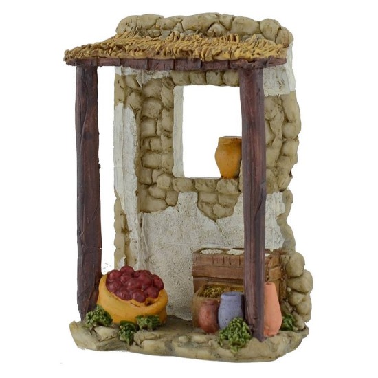 Tienda del hortelano en resina completa con productos, recomendada para figuras de 6,5-8 cm de altura. Ideal para completar las escenografías del belén.