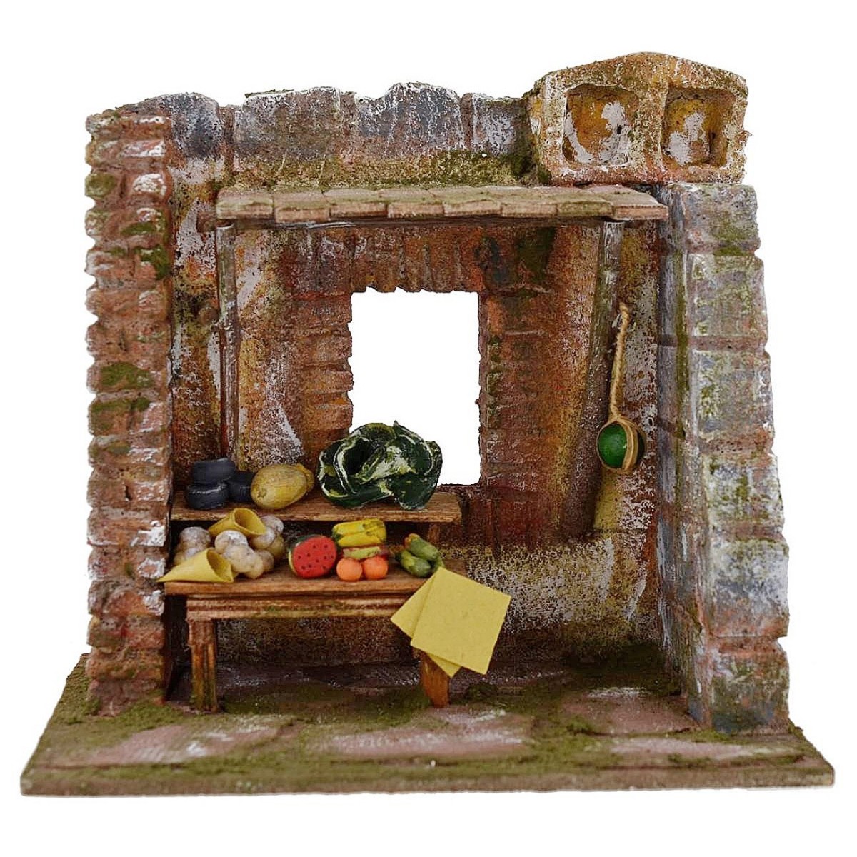 Escenario para pesebre en estilo Popular con un puesto de frutas y verduras coloridas en primer plano. La estructura presenta imponentes muros de piedra y un tejado que sobresale de la ventana desde la cual será posible vislumbrar el paisaje de su pesebre. Producto artesanal en poliestireno, madera y terracota, pintado a mano y recomendado para estatuas de altura 8-10 cm.