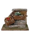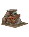 Escenario para pesebre en estilo clásico popular con cestas de verduras en primer plano apoyadas sobre un bloque de roca y como fondo una ruina de muro. Artículo artesanal bien acabado producido en poliestireno, madera y terracota, pintado a mano y recomendado para estatuas de altura 8-10 cm.