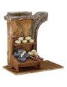 Mostrador de charcutería de madera en dos niveles con quesos y salamis expuestos, en la parte trasera una pared con techo plano con un toque de arco a la derecha. Ambientación para Pesebre clásico popular producido por artesanos italianos en madera, corcho y poliestireno, recomendada para estatuas de altura 10 cm.