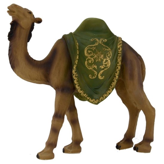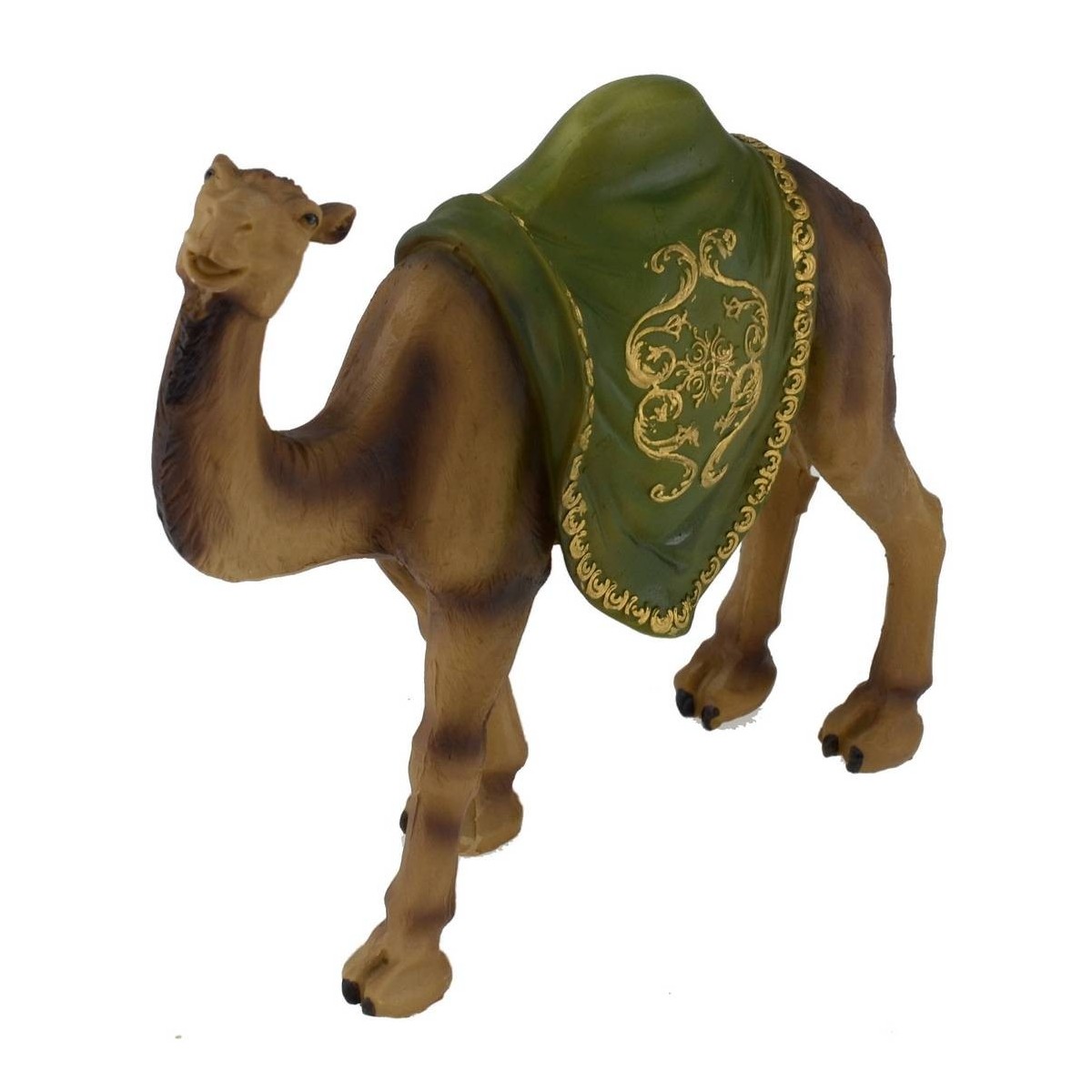 Dromedario de pie para pesebre de resina con manto verde con detalles en color oro, recomendado para figuras de 20-24 cm.