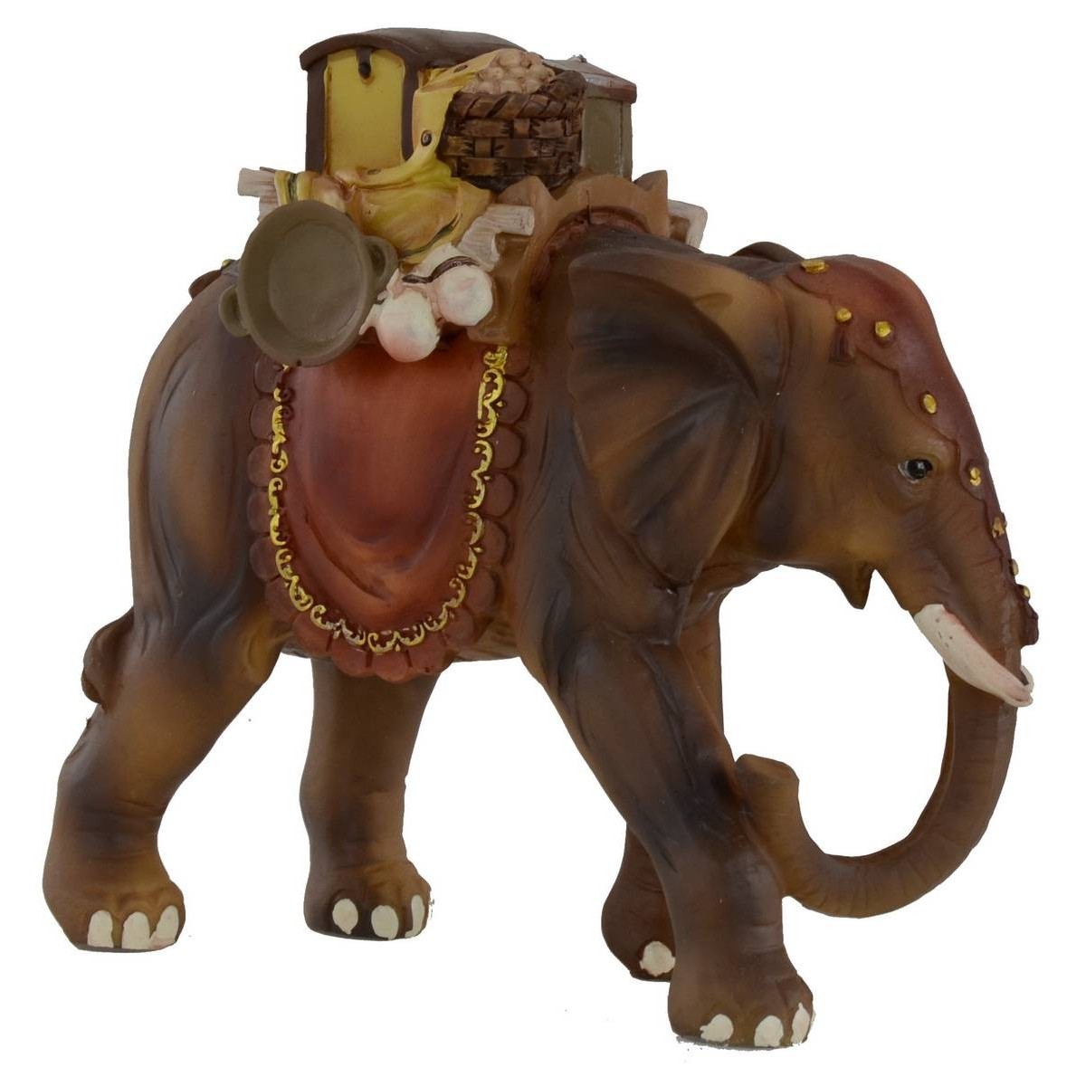 Elefante destinado al transporte con baúles y provisiones en resina, recomendado para estatuas de altura de 8 cm. El producto está realizado completamente en resina y es ideal para belenes y dioramas.