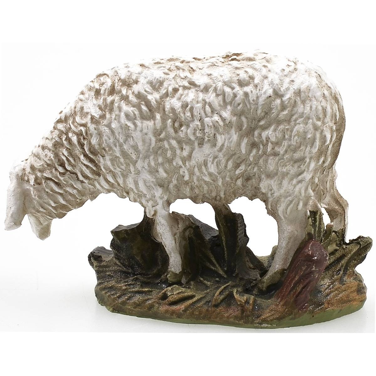 Oveja sobre base con cabeza baja para estatuas de altura 10 cm. Esta serie económica de importación fue diseñada por el escultor Martino Landi y está producida en resina pintada.