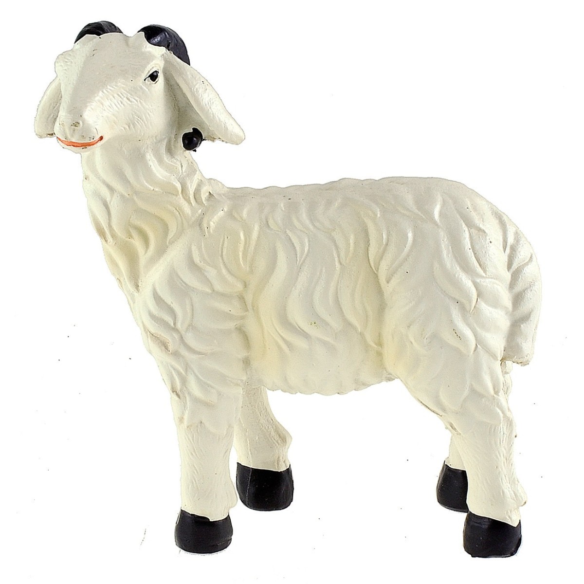 Carnero de resina con la cabeza girada hacia una dirección y con vetas amarillas en el pelaje. El artículo es ideal para la realización de belenes hechos a mano y se recomienda para estatuas de altura de 15 a 20 cm.
