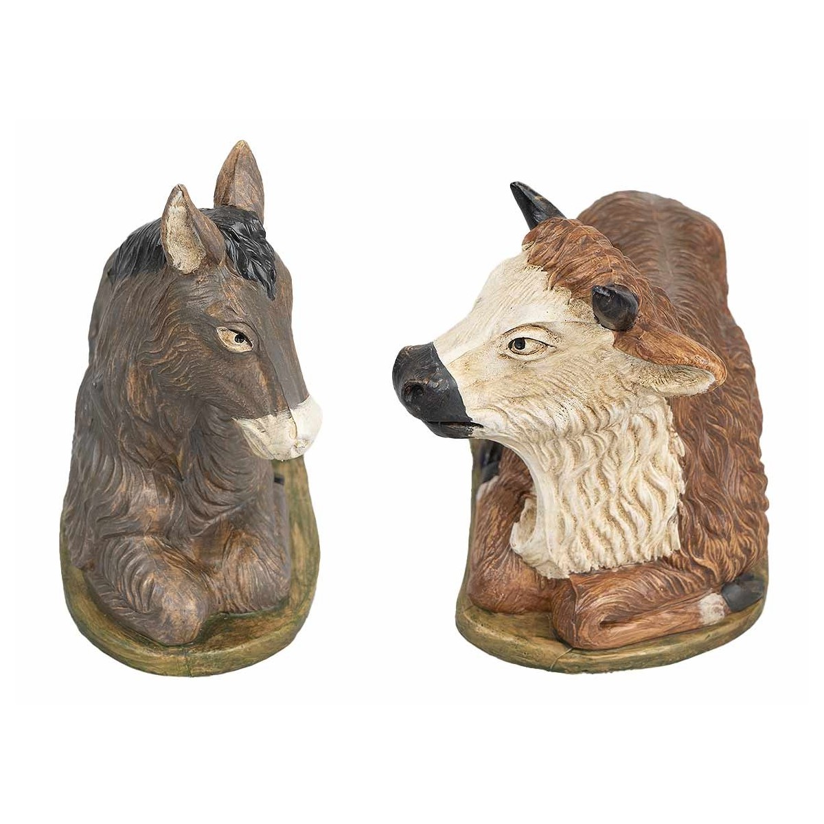 Pareja compuesta por buey y burro representados en posición acostada, con detalles realistas del pelaje y las expresiones que los hacen ideales para completar la escena de la Natividad.