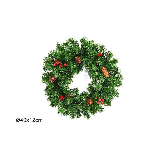 Guirnalda para puerta decorada con bayas y piñas, el diámetro exterior mide 40 cm. El artículo es ideal para crear un ambiente navideño en sus hogares.