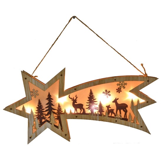 Estrella cometa iluminada que funciona con baterías 2xAAA (no incluidas). La escena representada en el interior es un típico entorno de montaña con reno y corzos en el bosque.