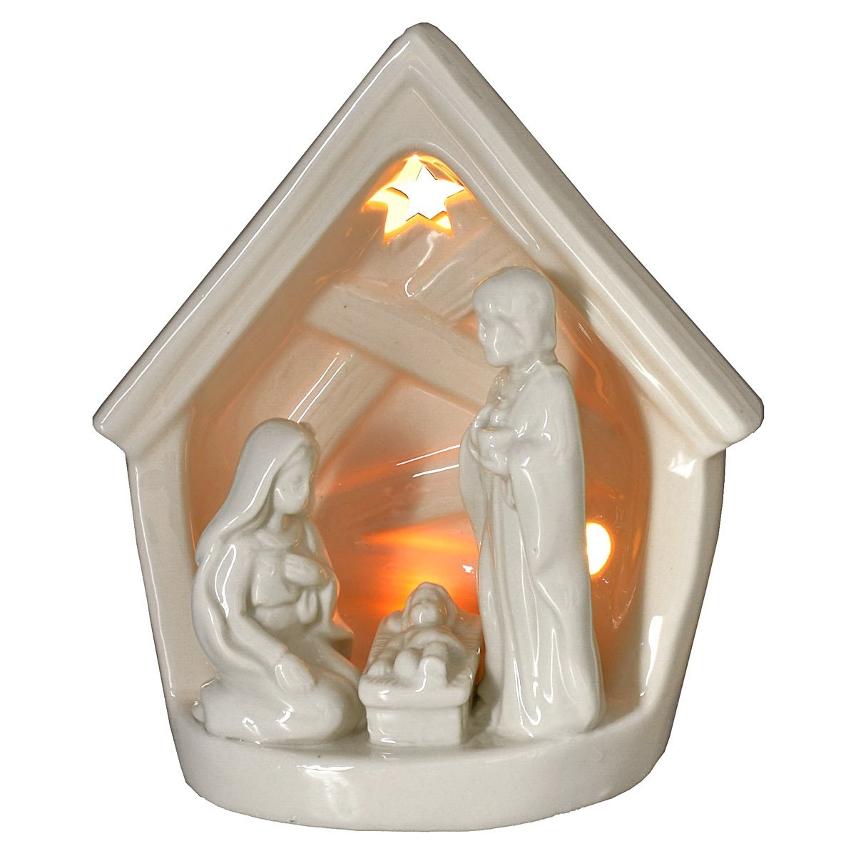 Cabaña de cerámica con estrellas iluminadas y Natividad 3D. El artículo funciona con baterías (3xLR44 incluidas) colocadas debajo de la base y se activa con el interruptor para encender y apagar la luz.