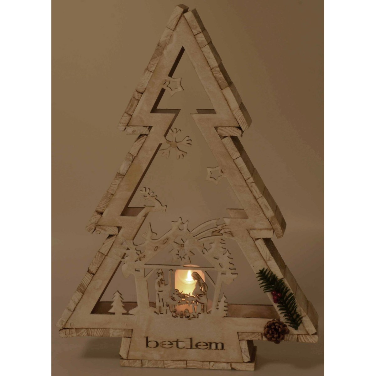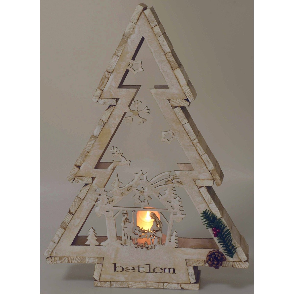 Árbol de madera blanca con la Natividad integrada, enriquecido con copos de nieve y estrellas y con inscripción en la base. Detrás de la Natividad hay un pedestal donde se puede colocar la vela de batería (no incluida) para la iluminación. En nuestro sitio web está disponible una amplia gama de velas, algunas de las cuales se enumeran debajo de la tabla en los productos relacionados.