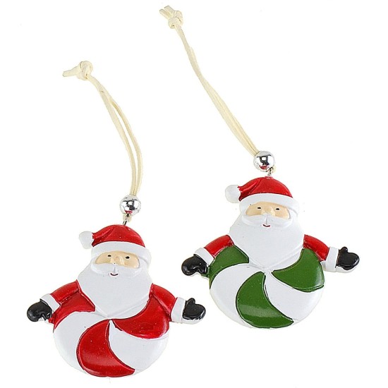 Conjunto compuesto por dos Papá Noel para colgar en el árbol. Estas decoraciones navideñas de resina están disponibles en dos colores: rojo y blanco o verde.