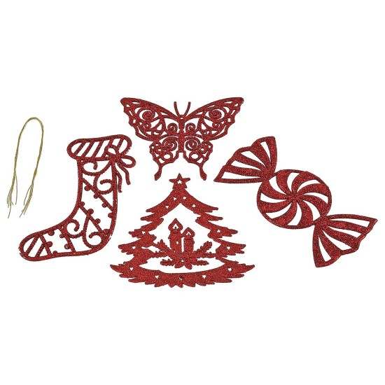 Decoraciones navideñas para colgar de color rojo con brillo, hechas de plástico y completas con cordones. El set se compone de cuatro figuras: bota, mariposa, caramelo y árbol de Navidad. Los artículos son ideales para crear adornos navideños para casas y árboles.