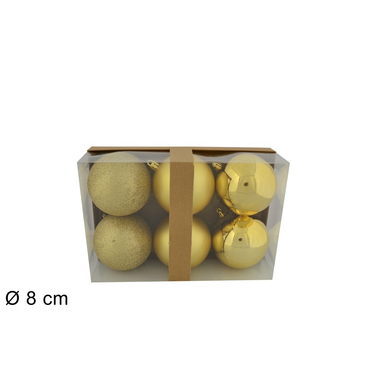 Juego compuesto por 6 esferas color oro brillantes, con glitter y perladas con un diámetro de 8 cm para árbol de Navidad. En nuestra tienda online están disponibles esferas del mismo modelo en otros colores.