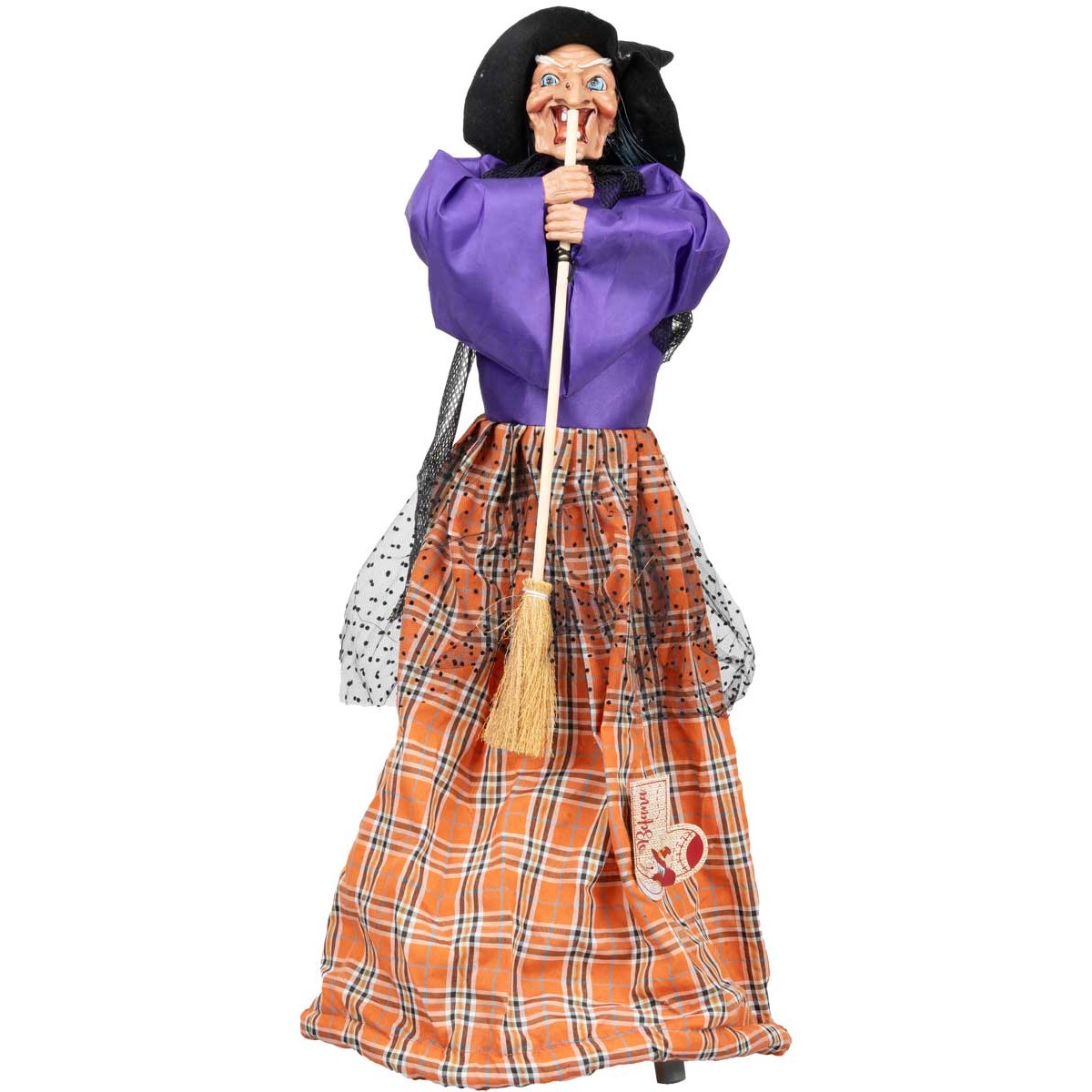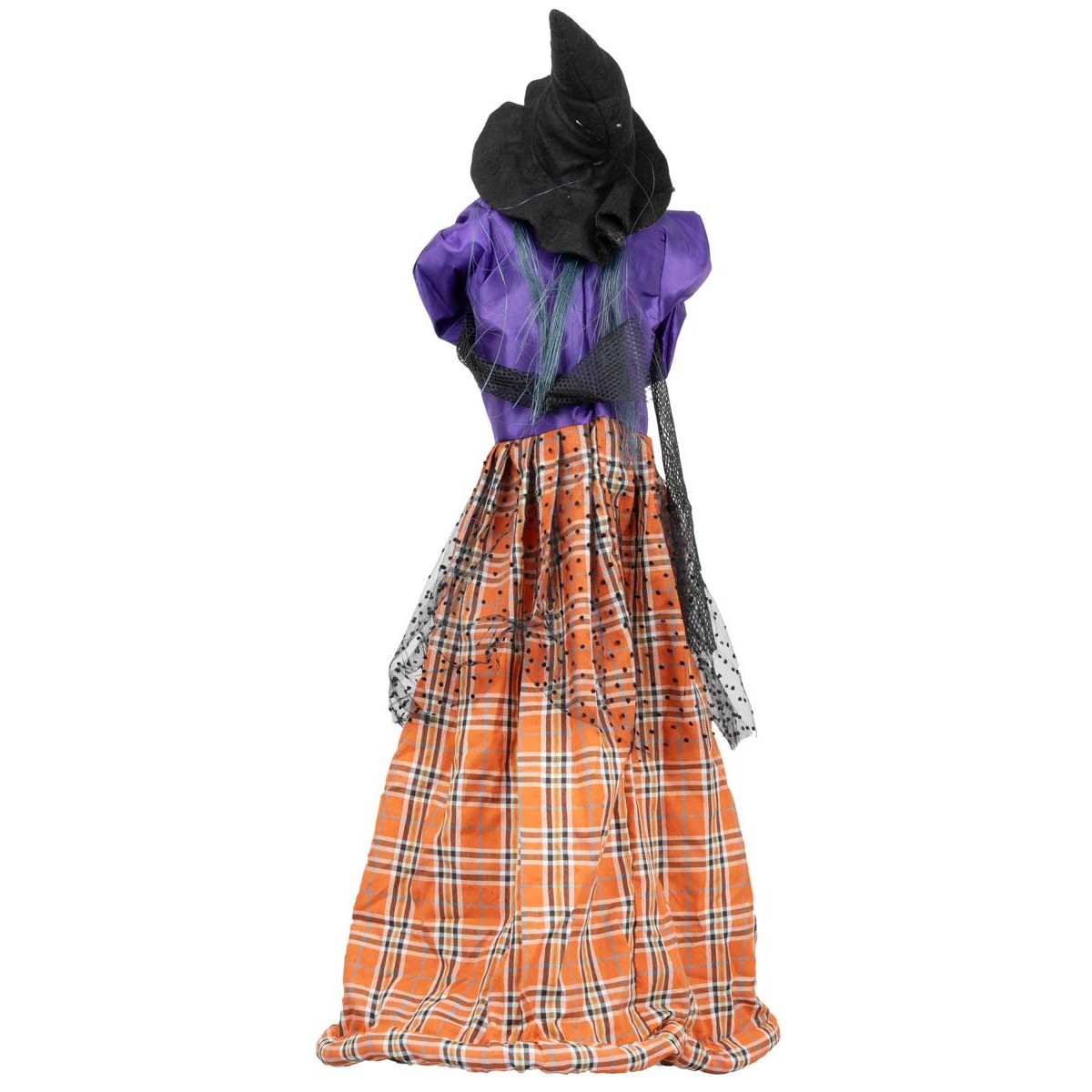 Befana de pie, vestida con un vestido violeta de mangas largas y una falda a cuadros en tonos naranja y marrón, superpuesta por una tela transparente negra. El look se completa con un típico sombrero puntiagudo negro y un velo a juego. En la mano, esta Befana sostiene una escoba de madera. La figura está equipada con piernas para montarla de pie y presenta efectos sonoros y visuales: está equipada con un sensor que, al tocarla, activa un parpadeo rojo en los ojos y una risa. Funciona con baterías LR45, incluidas y reemplazables.
