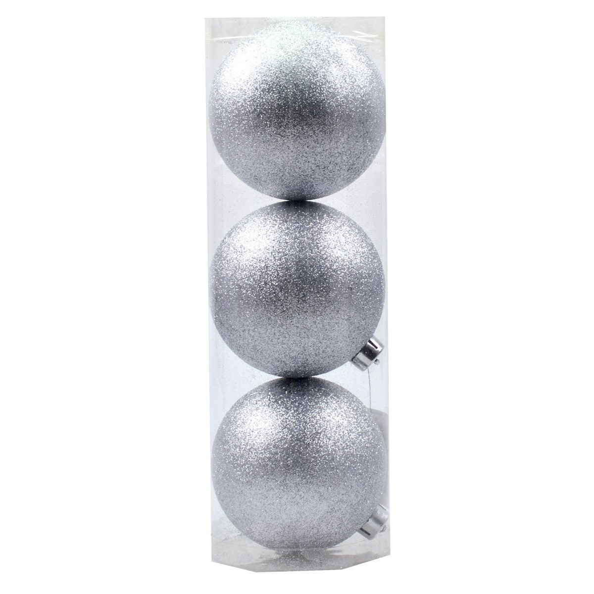Conjunto compuesto por 3 bolas de 12 cm para árbol de Navidad color plata con brillantina, el conjunto incluye cintas para colgar las bolas en el árbol. En nuestra tienda en línea están disponibles bolas del mismo modelo en otras medidas.