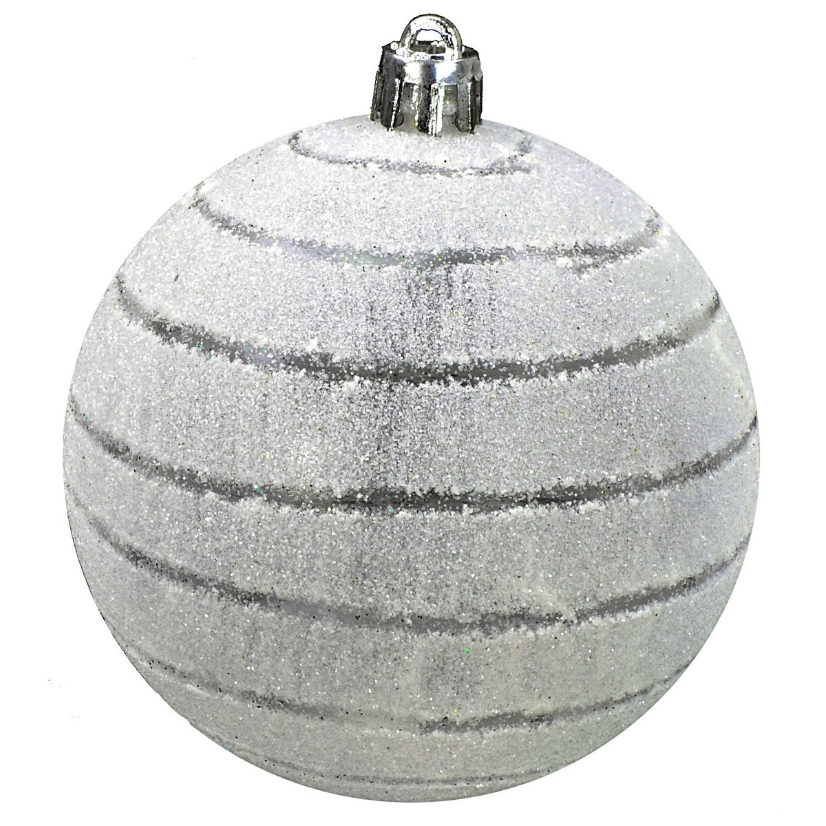 Bola para árbol de Navidad de 8 cm de color blanco con purpurina y rayas. En nuestra tienda en línea están disponibles bolas del mismo modelo en otros tamaños.