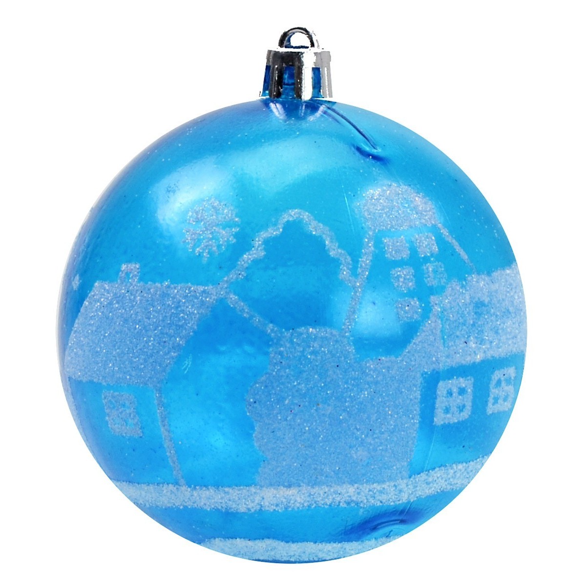 Bola para árbol de Navidad de 8 cm turquesa con paisaje decorado en color blanco con brillo. En nuestra tienda en línea están disponibles bolas del mismo modelo en otros tamaños.
