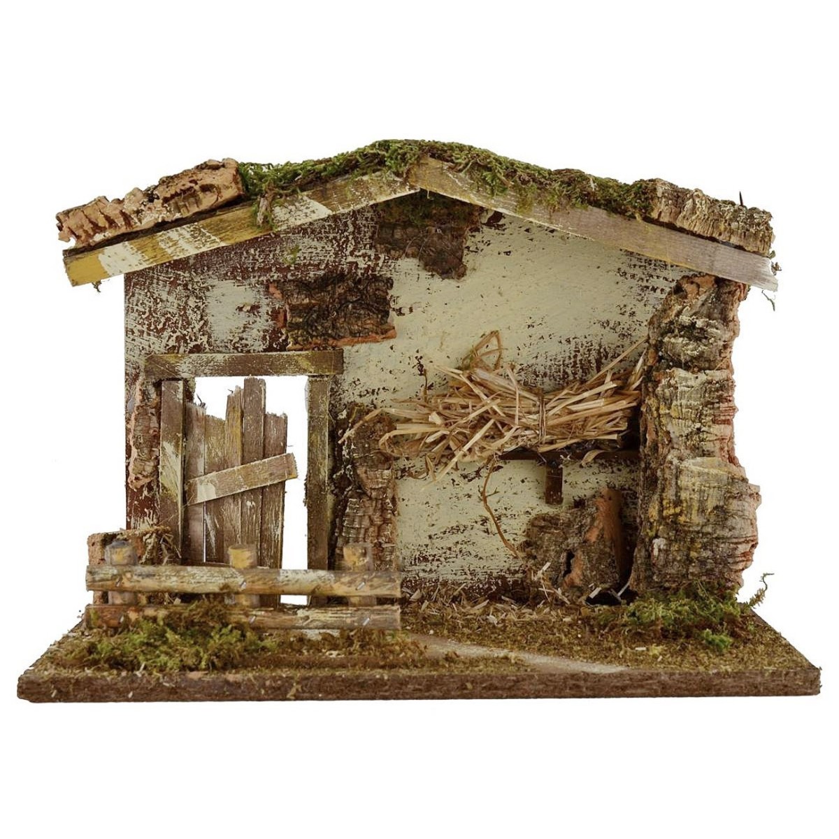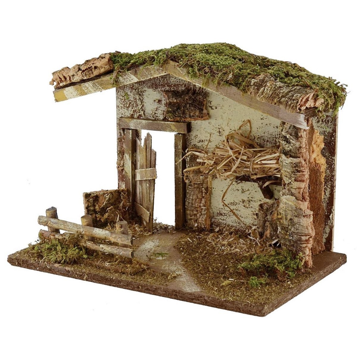 Cabaña realizada artesanalmente en Italia por hábiles manos artesanas utilizando madera, corcho y musgo. La escenografía se caracteriza por una cabaña delineada por el techo triangular y la verde vegetación circundante. Dentro de la cabaña podemos notar una cerca, una puerta de madera semi abierta y un fajo de paja apoyado en un estante de madera. En los productos relacionados es posible encontrar estatuas de Natividad con una altura recomendada de 10 a 12 cm.