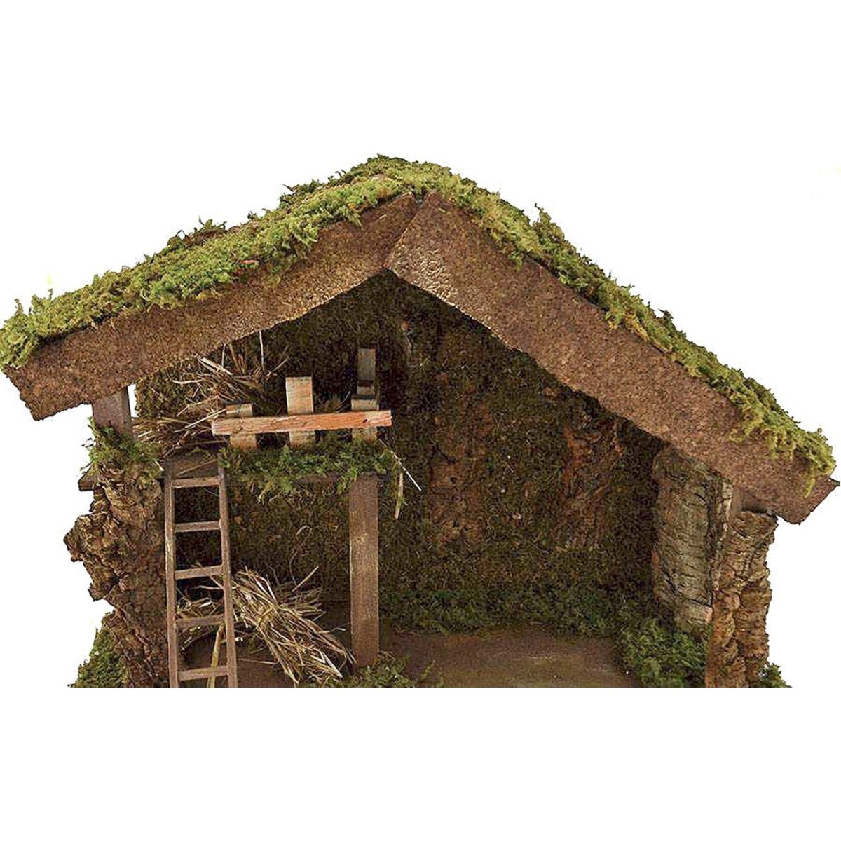 Cabaña artesanal para belén con luz blanca cálida que funciona con corriente, hecha de madera, corcho y musgo, recomendada para estatuas de altura 20-22-24 cm.