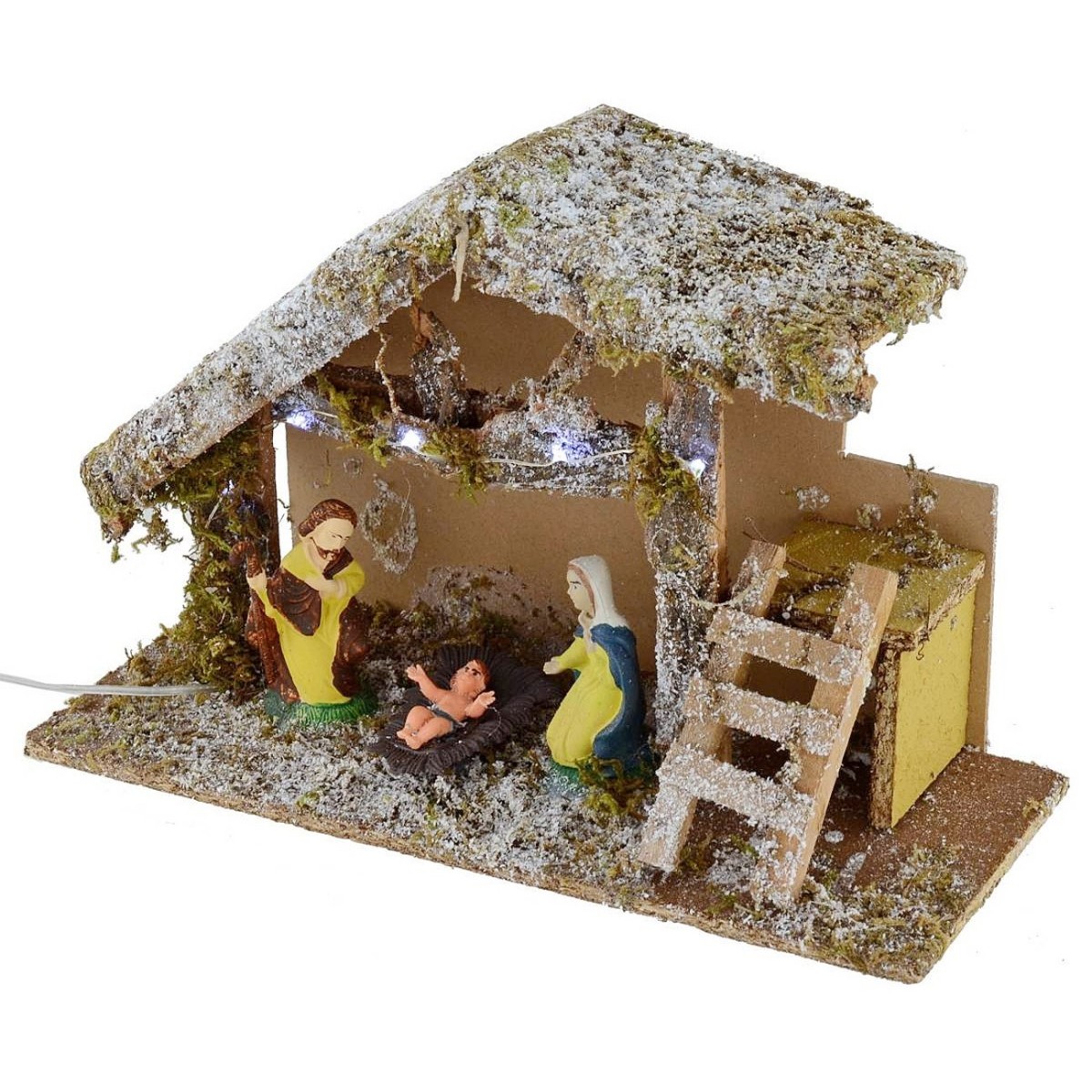 Cabaña nevada iluminada por una serie de luces LED frías que funcionan con batería (2 pilas AA no incluidas), con dimensiones: 31x12,5x20 h cm. La cabaña se presenta completa con Natividad en PVC, de la serie de 10 cm, formada por: San José, María y el niño Jesús. Las estatuas, arrodilladas, tienen una medida real de aproximadamente 7,5 cm. Producto realizado artesanalmente en Italia utilizando: madera, corcho, musgo.