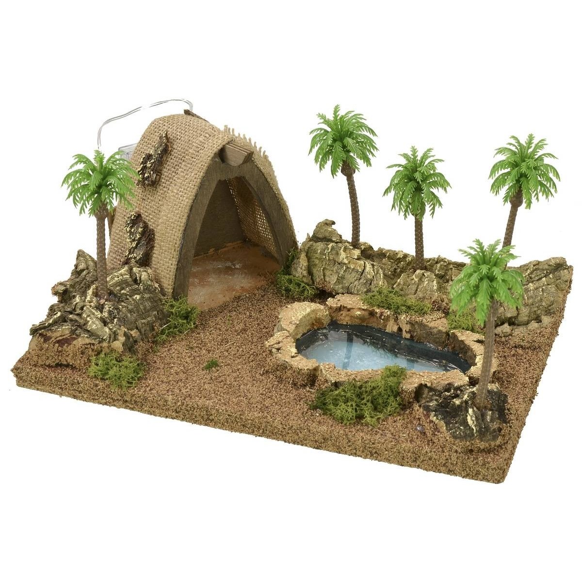 Tienda árabe iluminada bien acabada, situada en un paisaje natural caracterizado por la presencia de un pequeño lago con efecto de agua y profundidad, múltiples palmeras y arbustos. Es posible utilizar la tienda como cabaña y colocar en su interior estatuas de Natividad de la serie Landi Moranduzzo de 3,5 h cm, según tus gustos y preferencias, algunas de las cuales se proponen en los productos relacionados. El uso de corteza de corcho y musgo hace que el paisaje sea muy realista, ya que está lleno de vegetación. Otro elemento característico son las luces blancas cálidas que iluminan la escenografía, funcionando a batería (3 pilas AA no incluidas). El producto está realizado por hábiles artesanos italianos en corcho, madera y musgo para el Pesebre palestino.