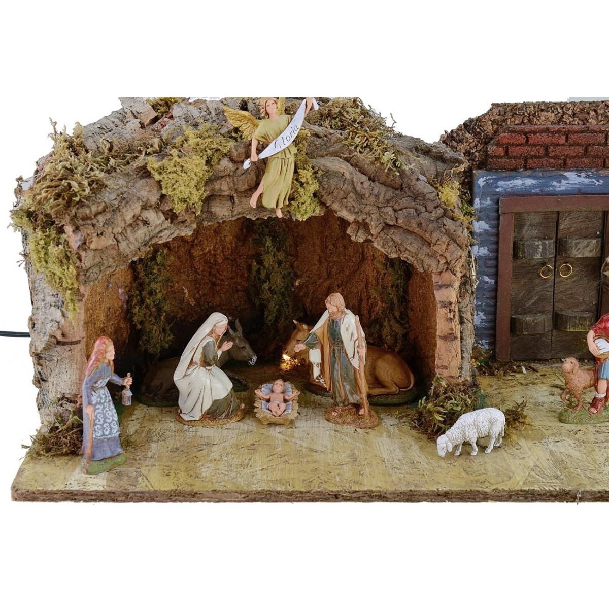 Escenografía artesanal compuesta por una cueva y una fachada con portón, iluminados por luces cálidas que funcionan con corriente. La cueva resulta muy realista, gracias al uso de corteza y musgo, que simula una densa vegetación verde circundante. Dentro de la cueva se coloca la Natividad de la serie 10 cm Landi Moranduzzo (altura real 9 cm); al igual que frente al portón se colocan estatuas de la misma altura. Para completar la sugestividad del producto, hay numerosas luces cálidas que funcionan con corriente. Producto realizado íntegramente en Italia por manos artesanas expertas, utilizando madera, corcho y musgo.