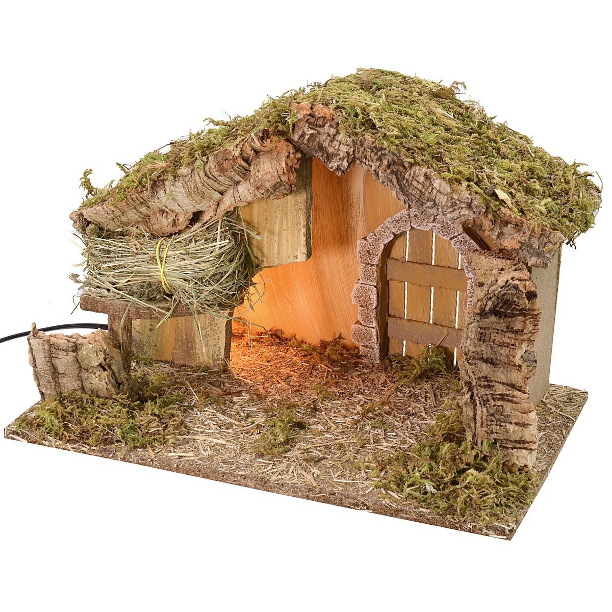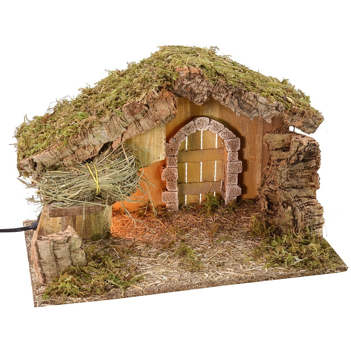 Cabaña con granero completo de paja mientras que al fondo hay una puerta arqueada de madera rodeada de ladrillos. El techo de la cabaña está cubierto de musgo, que también está presente en otras partes del entorno, mientras que el suelo está cubierto de paja. En el interior hay una luz eléctrica para iluminar la cabaña. Se recomiendan figuras de una altura de 10-12 cm presentes en la categoría del sitio 'estatuas de pesebre'. El artículo ha sido producido en madera, corcho y musgo.