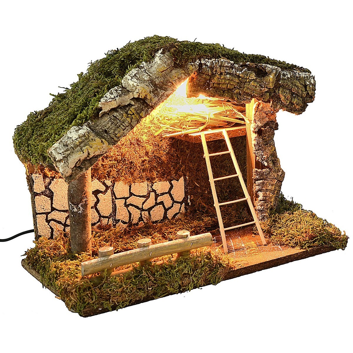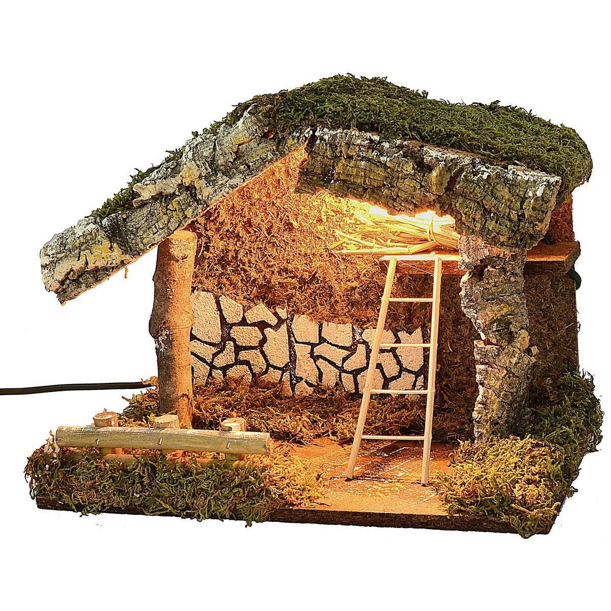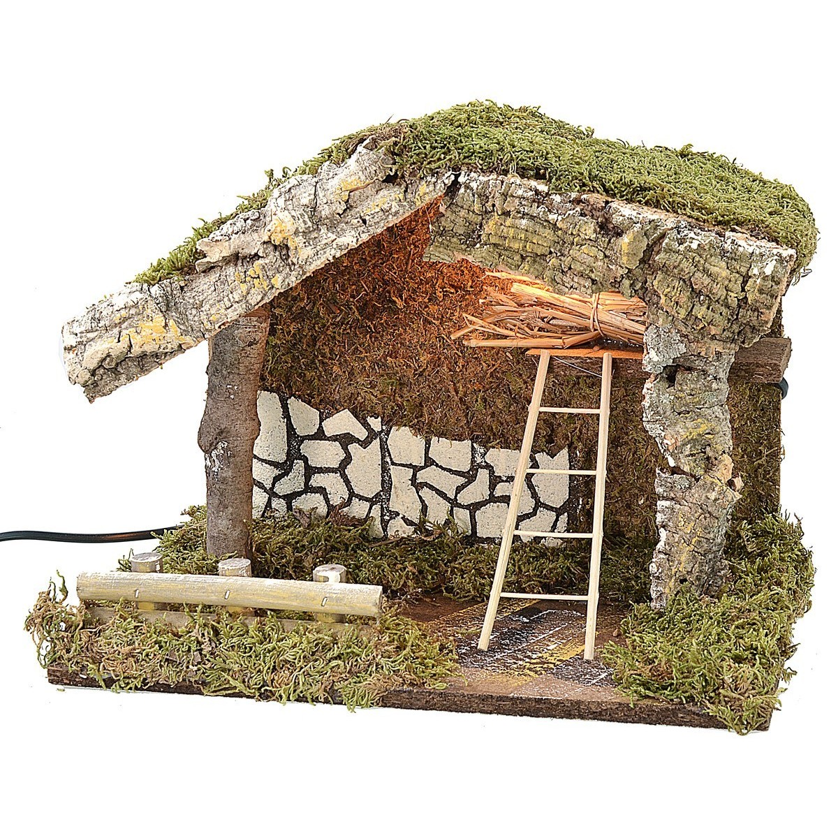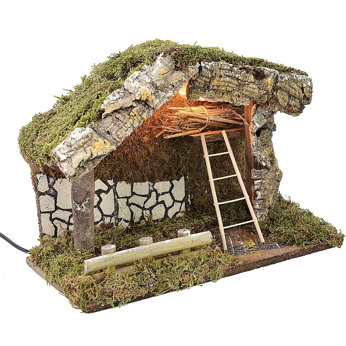 Cabaña iluminada con altillo sobre el cual se coloca paja, accesible a través de una escalera de mano; al fondo encontramos un muro de piedras talladas mientras que el techo de la cabaña está decorado con musgo. El artículo ha sido producido por hábiles manos artesanas en madera, corcho y musgo, se recomienda para estatuas de altura de 10 cm y la luz funciona con corriente.