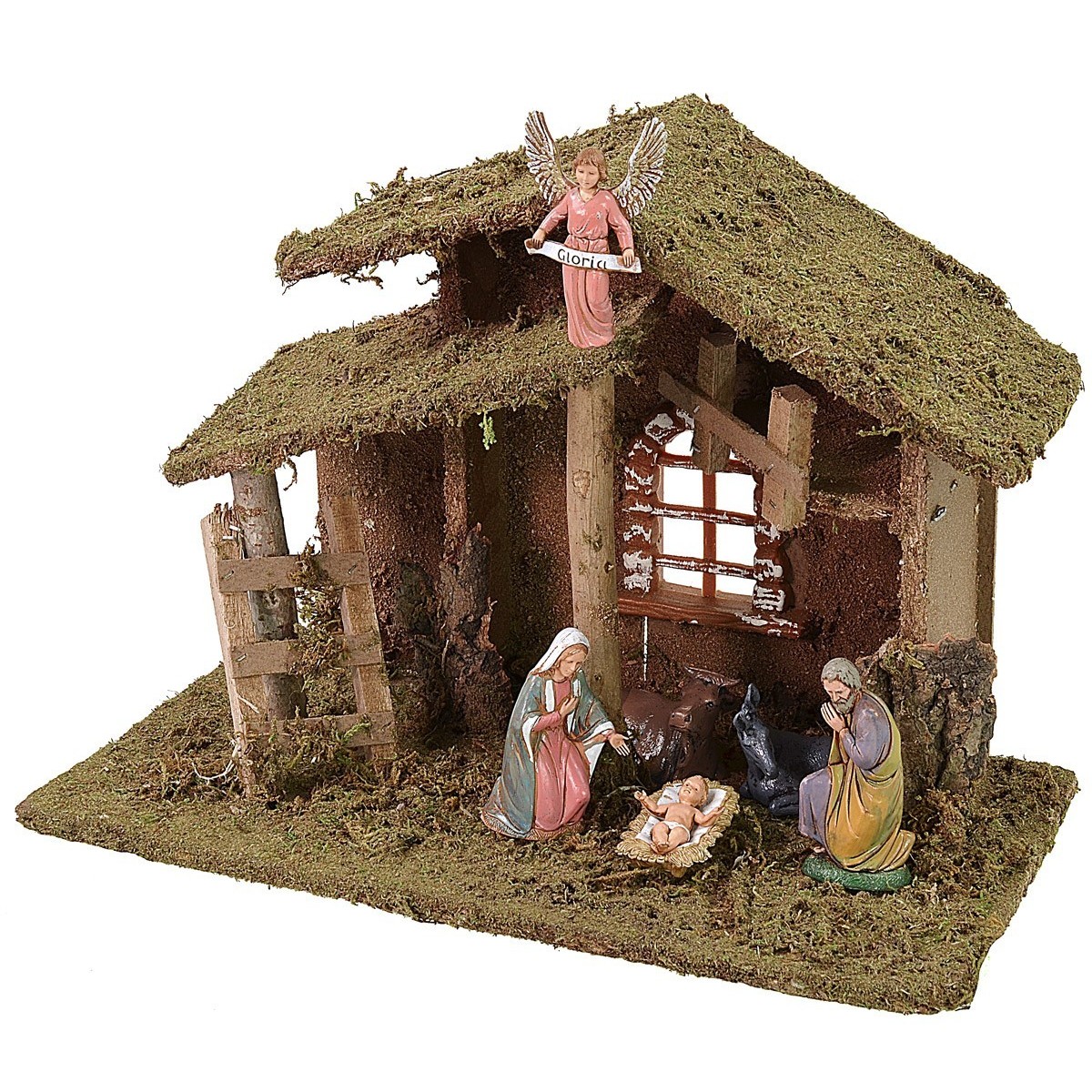 La cabaña será enviada con la misma cantidad de sujetos mostrados en la foto: Niño Jesús, María, San José, buey, burro y ángel, todos pertenecientes a la colección Landi Moranduzzo. Se precisa que la serie Landi de 10 cm mide realmente aproximadamente San José 7,5 cm y María 7 cm de altura.