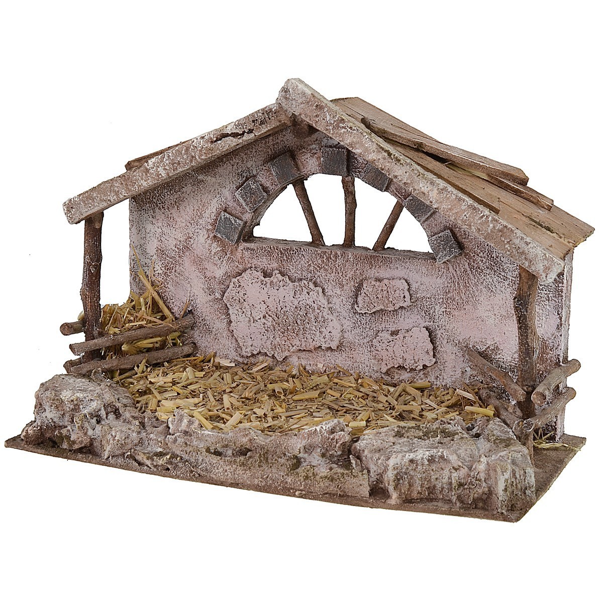 Cabana para Belén bien proporcionada con suelo de paja donde colocar la Natividad, en las esquinas del fondo hay dos pesebres, uno de ellos lleno de heno. La pared trasera está decorada con una gran apertura en arco acabada con ladrillos y el techo de madera se caracteriza por algunas tablas oblicuas superpuestas. El artículo es adecuado para estatuas de 10 cm de altura y ha sido realizado por hábiles manos artesanas italianas con madera y corcho. En los productos relacionados debajo de la tabla hay algunas Natividades adecuadas para la estructura.