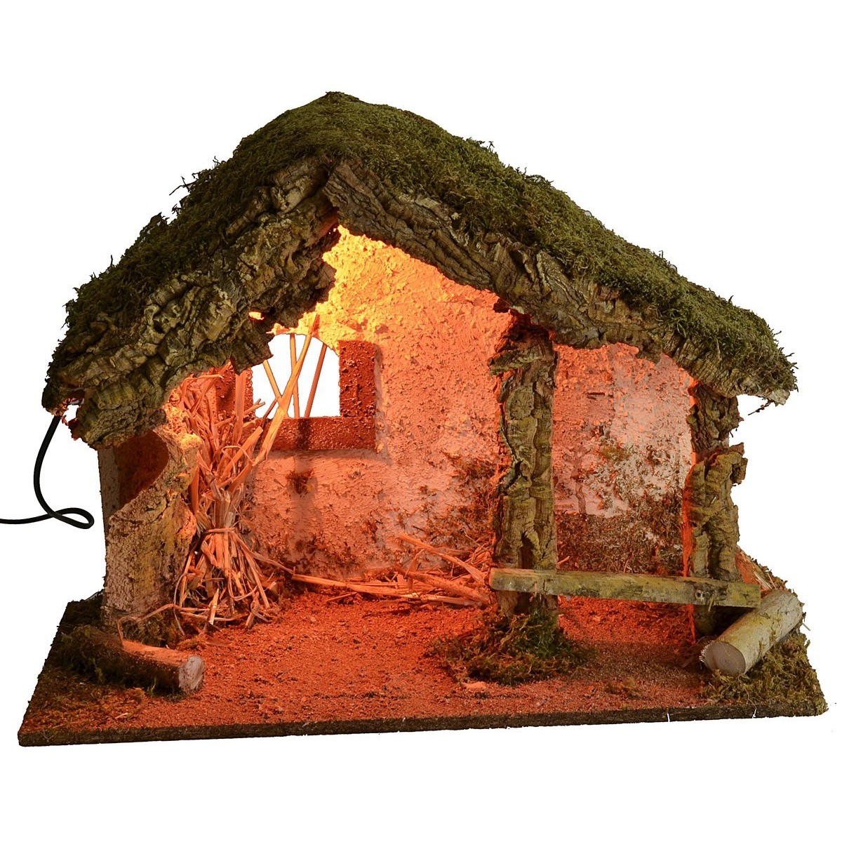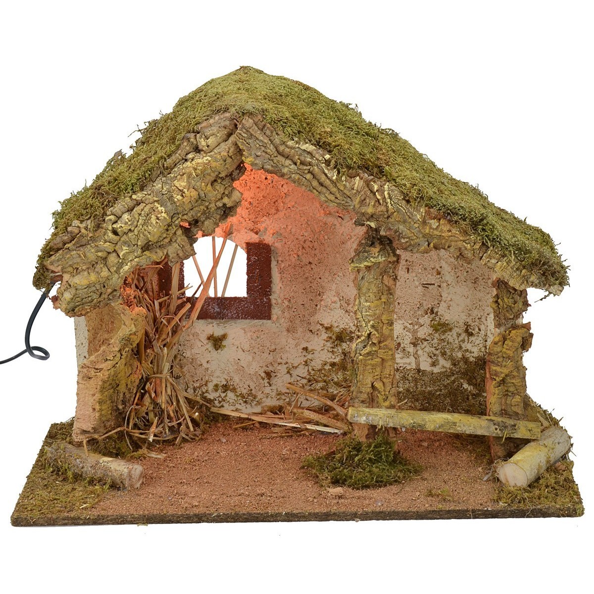 Cabana para pesebre iluminada bien proporcionada y rica en detalles, la estructura es de madera, corcho y musgo; en la parte trasera una ventana que permite la visión al exterior, dentro del heno y un rincón para los animales. El artículo enmarcará excelentemente la Natividad que vayas a colocar, se recomiendan estatuas de altura de 14-15 cm.
