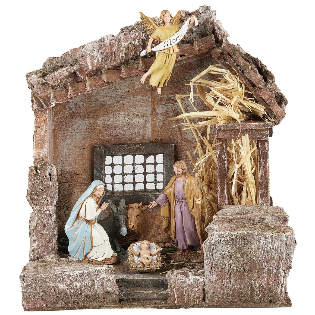 La escena representa una cabaña rústica con techo inclinado que aporta movimiento y dinamismo a la estructura. En el lado derecho hay un gran comedero lleno de heno que enriquece el ambiente del establo mientras que al fondo se encuentra una pequeña ventana cuadrada que da profundidad a la escenografía.