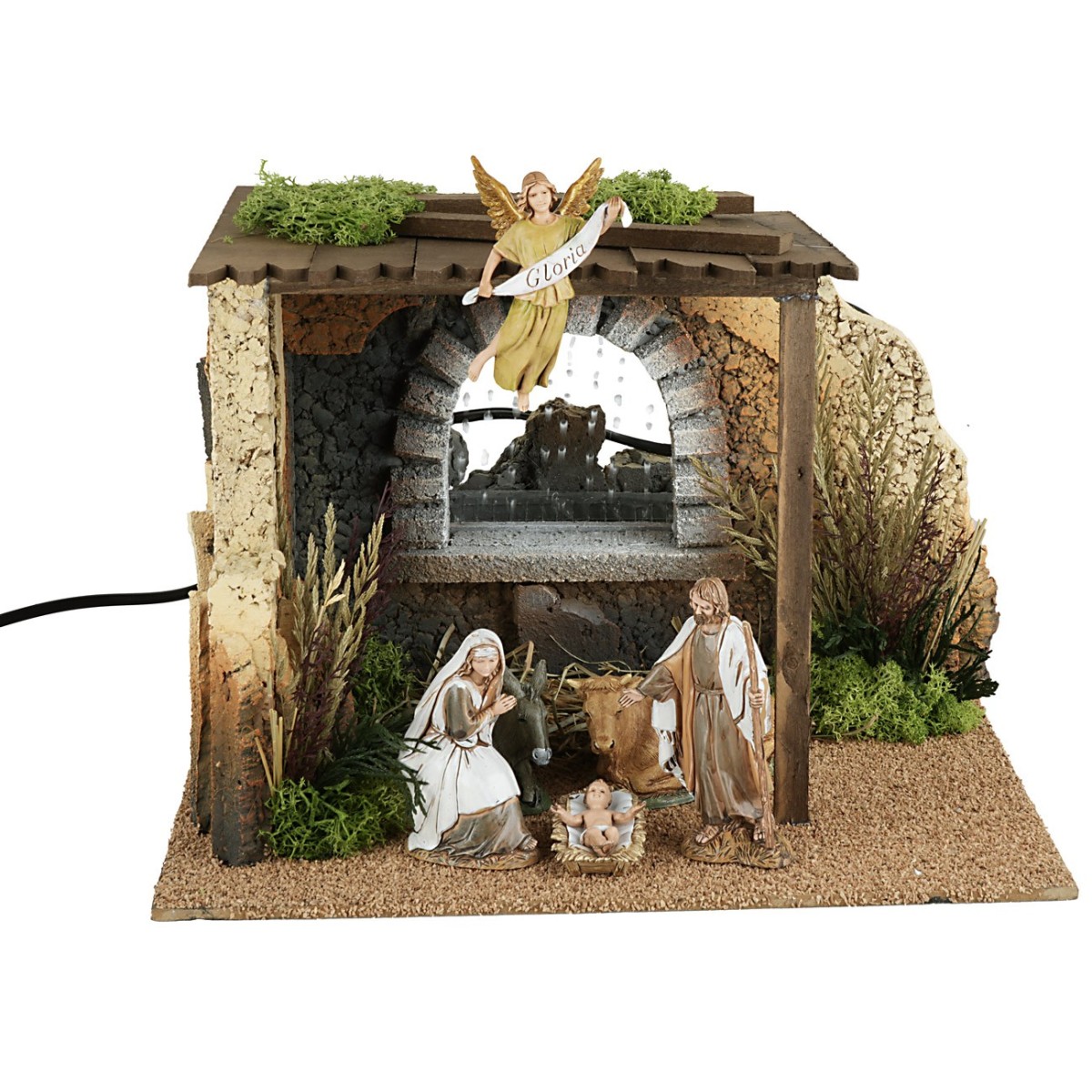Cabaña para pesebre en ángulo abierta en el frente y en el lado derecho, terminada en los más mínimos detalles. La escenografía presenta un cobertizo de madera y en el fondo una apertura de arco acabada en ladrillos a la vista. Además, está equipada con efecto de lluvia, visible desde la apertura, que funciona con corriente. La cabaña es adecuada para el Nacimiento perteneciente a la serie atuendos históricos Landi Moranduzzo 10 cm, como se muestra en la foto, y está disponible en los productos relacionados debajo de la tabla. Se precisa que su altura efectiva es inferior al nombre de la serie y corresponde a 9 cm. El artículo está hecho en madera, corcho y musgo, a mano por artesanos italianos.