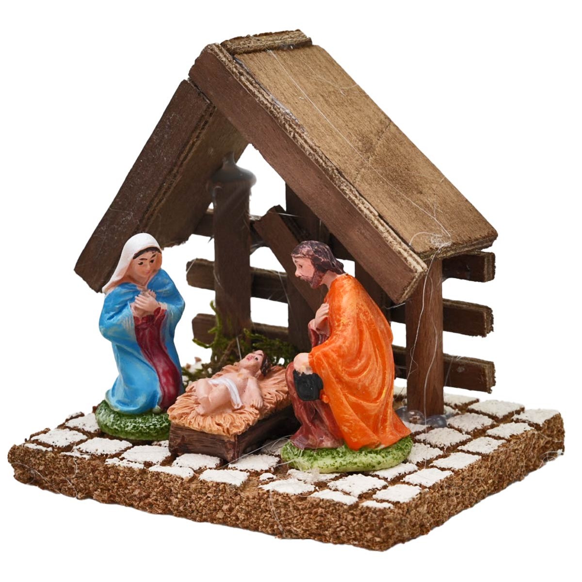 Cabaña completa de Natividad serie 6 cm, con estatuas arrodilladas que alcanzan una altura real de 4,5 cm. La estructura presenta un suelo de piedras blancas y paredes de madera envejecida, completadas con un techo inclinado. Realizada artesanalmente en Italia utilizando madera, corcho y musgo, representa una obra de gran detalle y calidad.