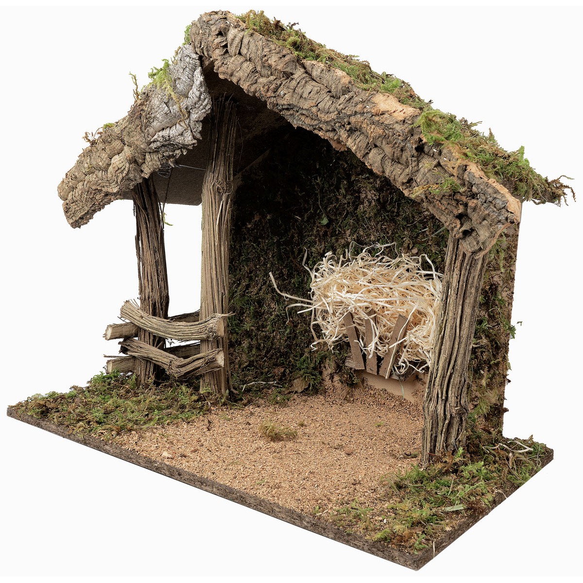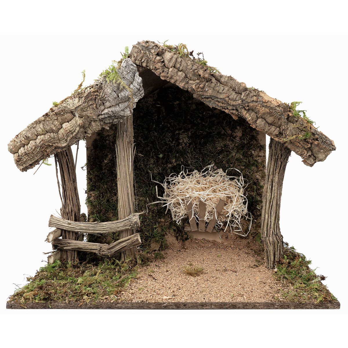 La estructura presenta un techo inclinado revestido en corteza de corcho, paredes rústicas y piso de arena, con pesebre central lleno de paja.